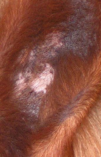 Januar 2005 | Keines der Sarkoide ist bisher zurückgekehrt. Die Nosode wird nicht mehr verabreicht. Im Ohr ist dickes Narbengewebe geblieben, alle anderen Stellen sind zwar noch haarlos, aber ohne Verdickungen. | |