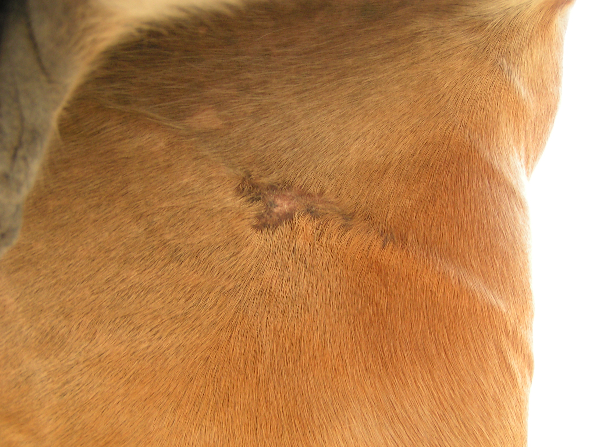 November - Dezember 2004 | XXTerra wird immer seltener nötig; es bleibt jedoch eine ständig offene bzw. verkrustete Wunde. Dies führt zu einer Infektion der Unterhaut, die antibiotisch behandelt wird. Die Tierärztin rät zum Auftragen von Vet-Sept-Salbe, einer Fettsalbe, die desinfizierend wirkt. Dies führt dazu, dass sich die Wunden innerhalb einer Woche schließen und Narbengewebe zurückbleibt. |